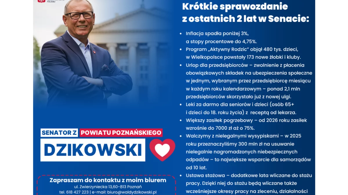 Senator Waldy Dzikowski: To nie były dwa lata odcinania kuponów, tylko nadrabiania zaległości państwa po latach chaosu. Najważniejsze jest to, że odzyskaliśmy stabilność. Inflacja spadła poniżej 3 procent, a stopy procentowe wróciły na poziom 4,75 procent. To nie jest sucha statystyka. To realna ulga dla rodzin, dla kredytobiorców, dla przedsiębiorców.